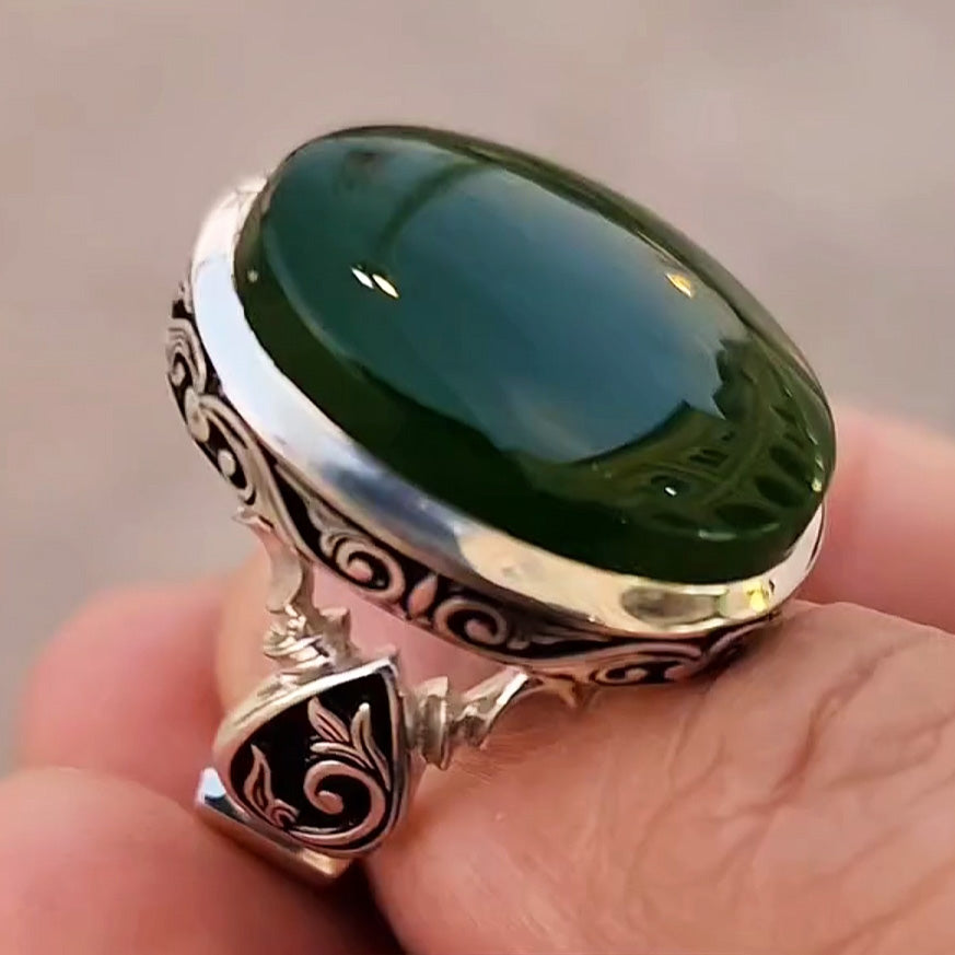 Regular price From $120.95 USDSale price From $120.95 USD Regular price $171.95 USDUnit price / perA genuine Yemeni ring featuring a dark green oval agate stone set in 925 sterling silver. This handmade ring comes with an engraved band design and...