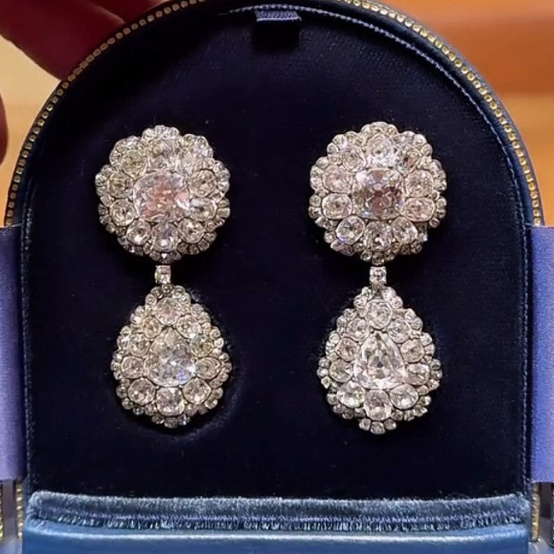 Regular price $130.00 USDSale price $130.00 USD Regular price $0.00 USDUnit price / perDescription These gorgeous vintage chandelier earrings will make you the talk of the party! Set with a combination of round cut white stones of varying sizes....