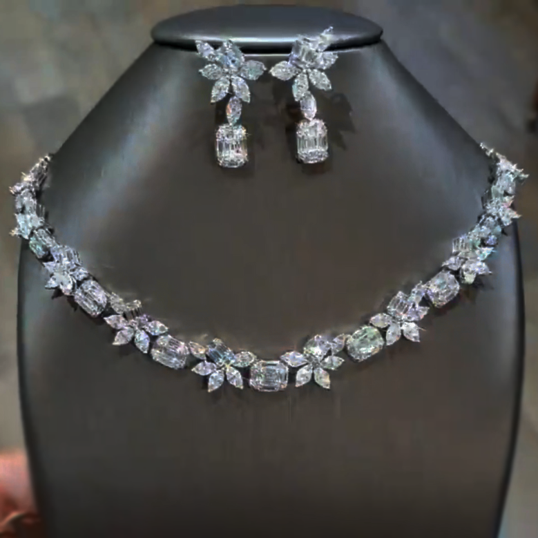 Elegant 30 ctw Multi-Cut White Gemstone Patchwork Earrings and Necklace Set -JEWELBUYS