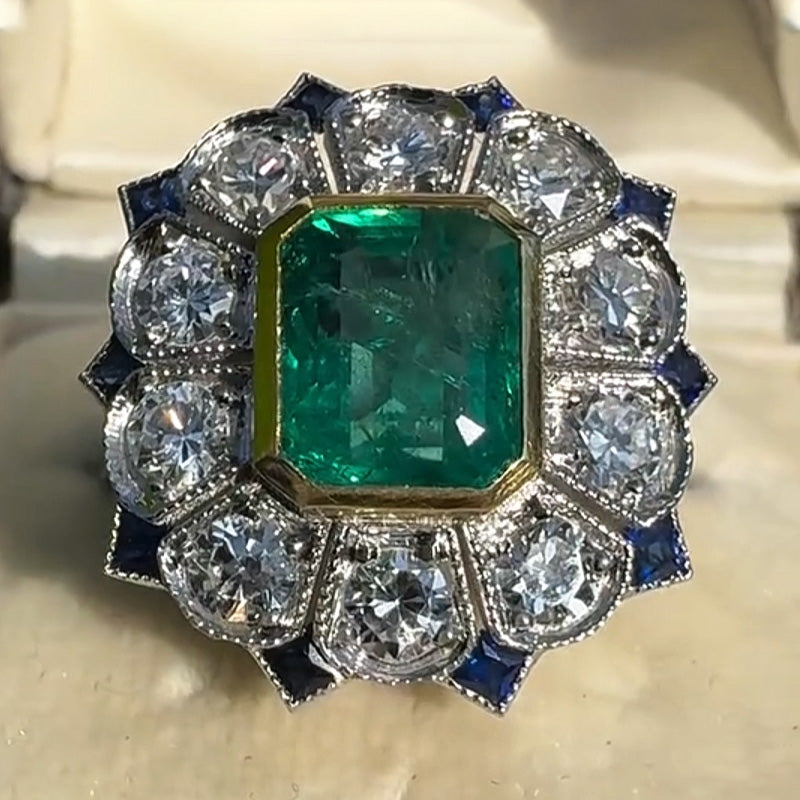 A classic and exquisite ring featuring a dazzling 10.8Ctw emerald and multi-shaped sapphires-JEWELBUYS