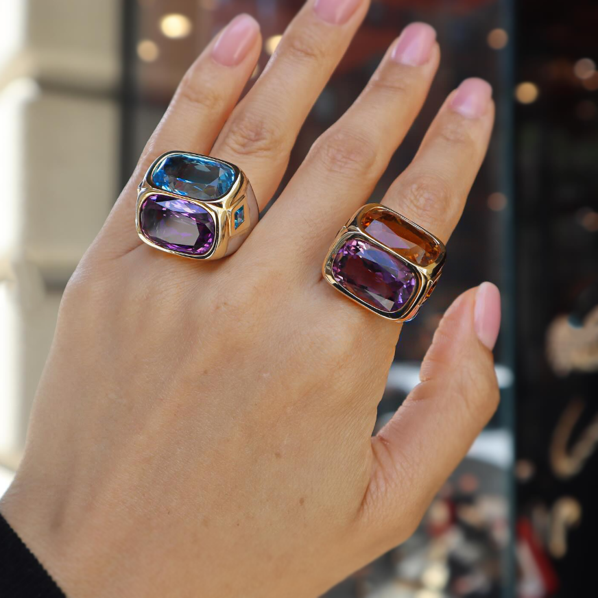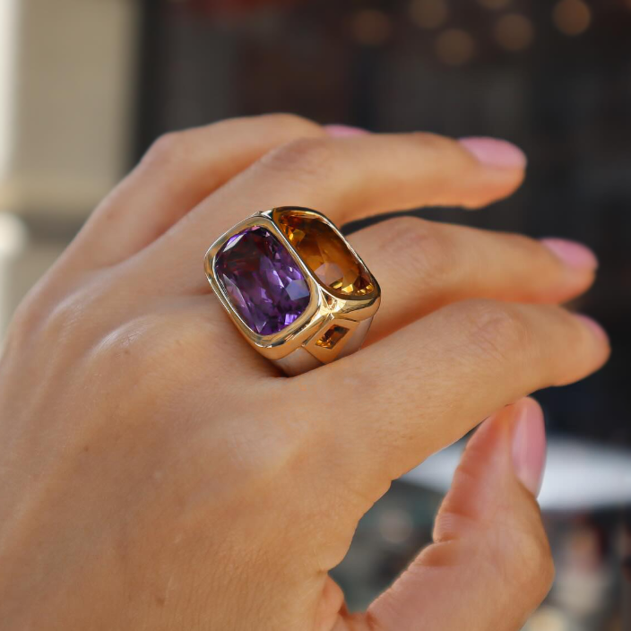Regular price From $130.00 USDSale price From $130.00 USD Regular price $0.00 USDUnit price / perDescription This unique two-stone cocktail ring is striking! The center features two huge bright cushion cut yellow & purple & blue main stones. The arms are...