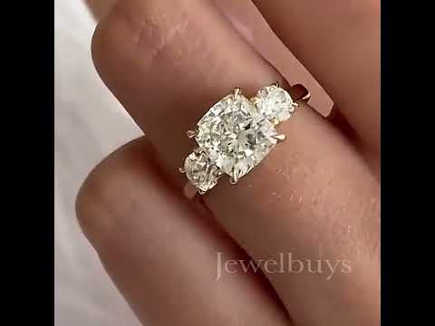 This is a three stone design ring with a 5.4ct cushion cut center stone and two side stones. The ring is made of 925 silver with thick gold plating. which gives it a longer lasting shine than other single layer gold plating. The style is simple and personalized. bringing more possibilities to your fashionable combination.
