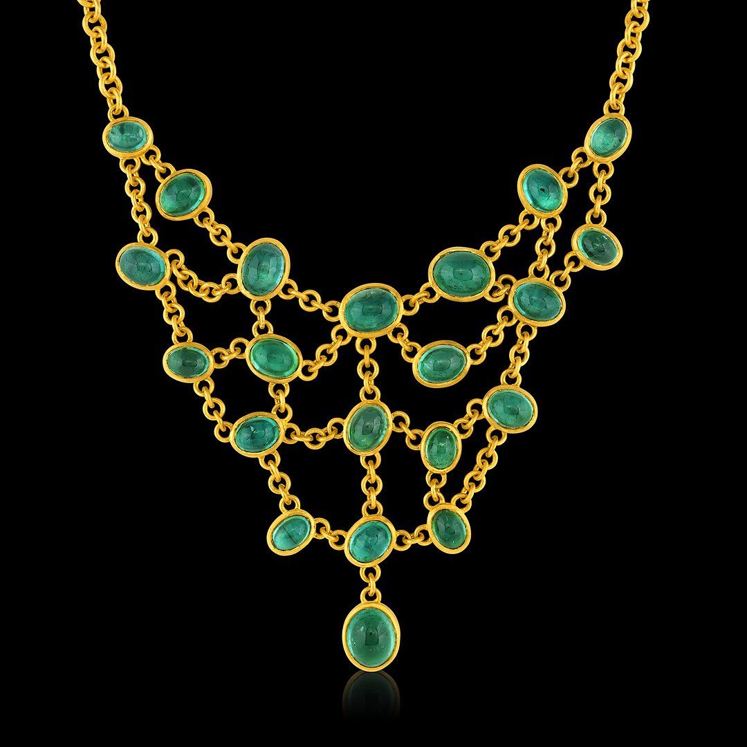 Our necklace features twenty-one tourmalines, delicate emerald cabochons draped around the neck like a web - like chain mail, but better. It creates a stunning web of gemstones, asymmetrical yet balanced.