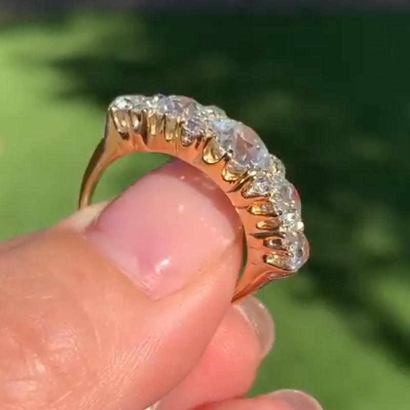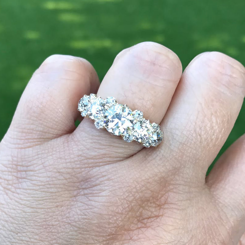 This ring features five full, antique European-cut sapphires, interspersed with smaller antique mine-cut and rose-cut sapphires in the center. It's dazzling and absolutely stunning when worn.
