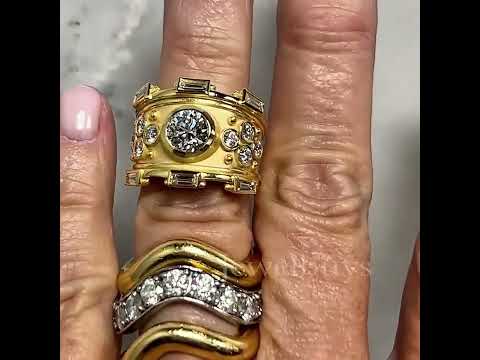 This is a one-of-a-kind ring - set with a round brilliant cut main stone, mixed with round and baguette cut stones.