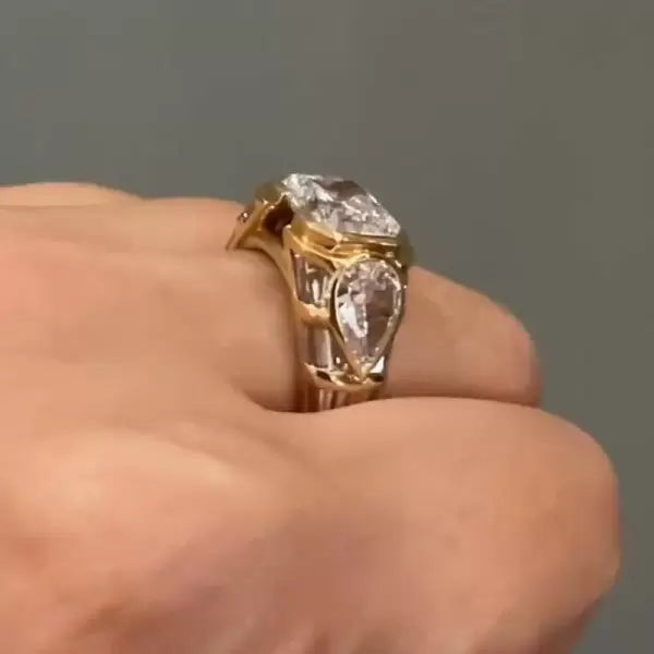 This is a vintage style ring. 3.5ct Radiant cut main stone is clean and bright. Half bezel setting design is very secure. The ring is made of 925 silver throughout and plated with thick gold which makes the shine last longer compared to other single layer plating. Bring more possibilities for your fashion collocation.