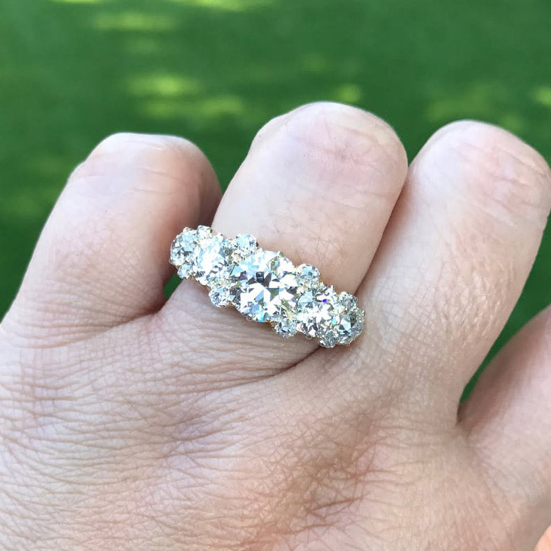 This is an incredibly gorgeous, massive Victorian five-stone ring. It's estimated at 3.50ctw and features some stunning, bright, fiery red Old European cushion-cut sapphires. This is the ultimate in bands .