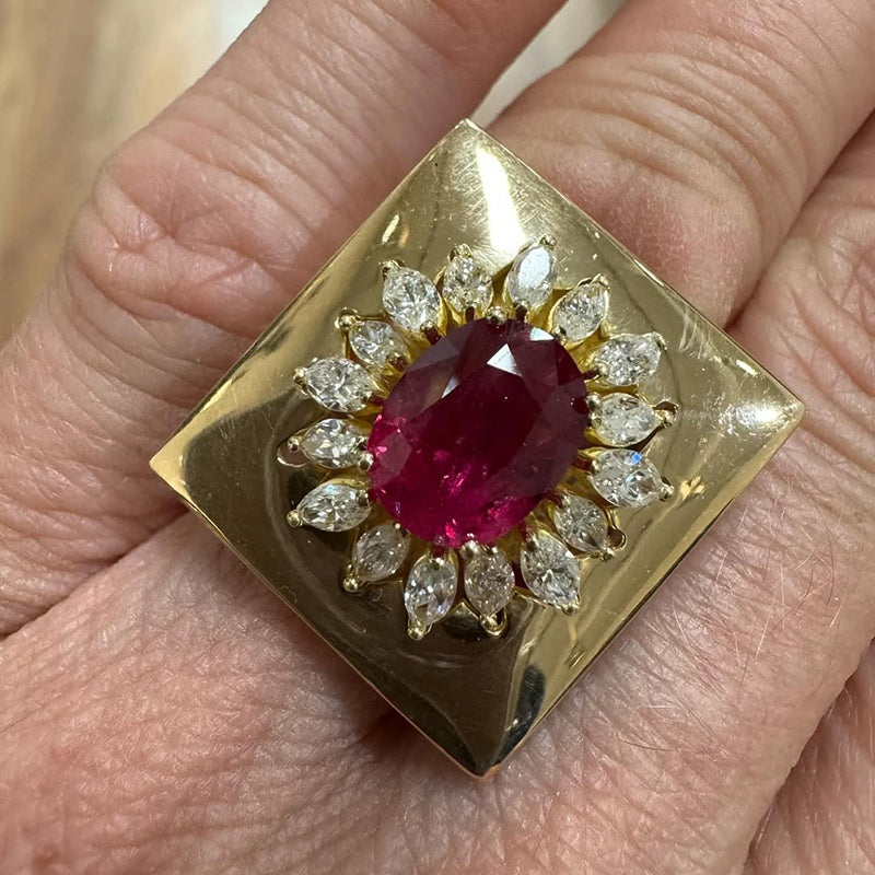 Incredible 3.90ctw Ruby and Marquise Sapphire 18k Gold Platter Cocktail Ring 🍸♥ We love everything about this beauty!!!!! From the vivid red color of the 2.15Ct to the marquise sapphire halo, to the highly polished mirror finish of the 18k gold platter ring, to the chunky cigar band shank. Simply put, everything is bright, bold, juicy and delicious.