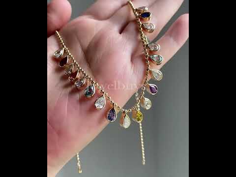 This is a pear cut multi-color sapphire station statement necklace. The dopamine-colored design is beautiful both alone and in stacks. The necklace is made of 925 silver with thick gold plating, which makes the luster last longer than other single-layer plating. The style is personalized and simple, bringing more possibilities to your fashion matching.