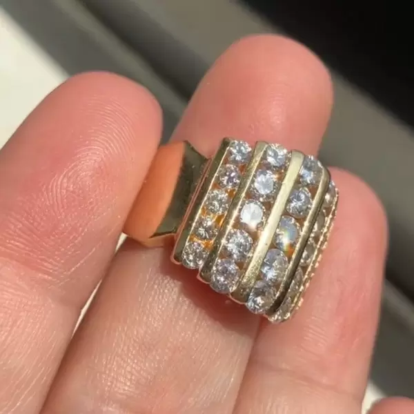 This stunning wedding band features a total of 3 carats of round cut white sapphires, channel set in gold tone band. The round cut sapphires offer a brilliant and consistent sparkle, while the channel setting ensures a secure and comfortable fit. The band adds a modern and sophisticated touch, making it a perfect complement to any engagement ring. Crafted with precision and care, this ring is a beautiful blend of luxury and timeless elegance. Ideal for marking your eternal commitment, it is a meaningful and stylish addition to any jewelry collection. Whether for a wedding or a special anniversary, this band is sure to shine with its stunning beauty and sophisticated design.