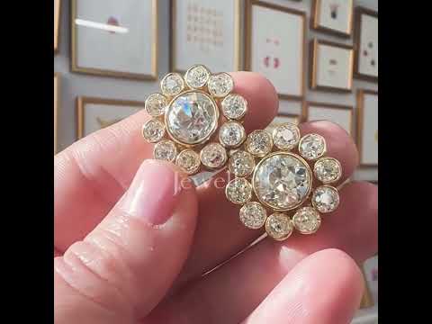Each earring features a central round cut gemstone encircled by smaller stones to emulate the look of a flower in full bloom. The floral design adds an element of femininity and grace, perfect for those who appreciate the beauty of nature translated into fine jewelry. The choice of metal can be tailored to complement personal style or match existing jewelry, providing versatility and timeless appeal.