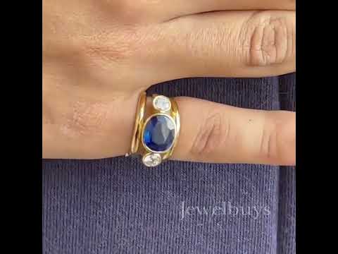 This stunning ring features a total of 3 carats of cushion cut sapphires, with a central blue sapphire flanked by two white sapphires. The cushion cut design offers a brilliant and romantic sparkle, while the combination of blue and white sapphires creates a striking and harmonious look. The three-stone setting symbolizes the past, present, and future, making it a meaningful and beautiful choice for any occasion. Crafted with precision and care, this ring is a perfect blend of classic beauty and modern sophistication. Ideal for engagements, anniversaries, or as a special gift, it captures the essence of timeless elegance and grace.