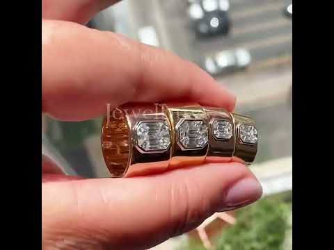 Not only is the square band comfortable to wear, but it's also very stylish and has a fun, modern look. As with the cigar style rings we make, the wider band looks nice and chunky on the finger! They have become a fan favorite, and for good reason! The stones are set in a platinum bezel with a yellow gold square band.