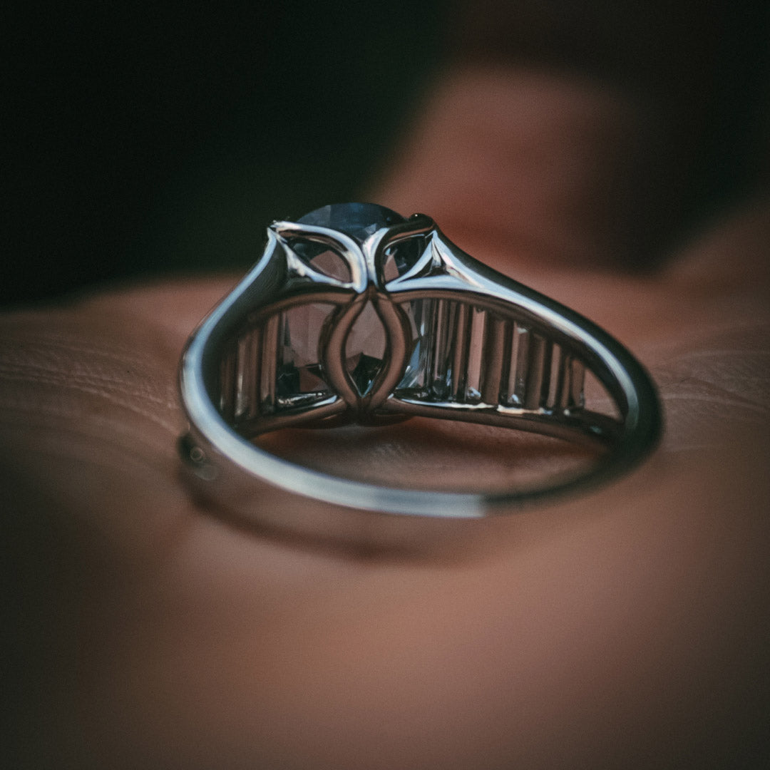 The ring features a beautifully proportioned oval sapphire in a serene, icy blue hue. The two sides of the band feature a forked design, set with specially calibrated trapezoidal sapphires to create a dazzling interplay of light and shadow.