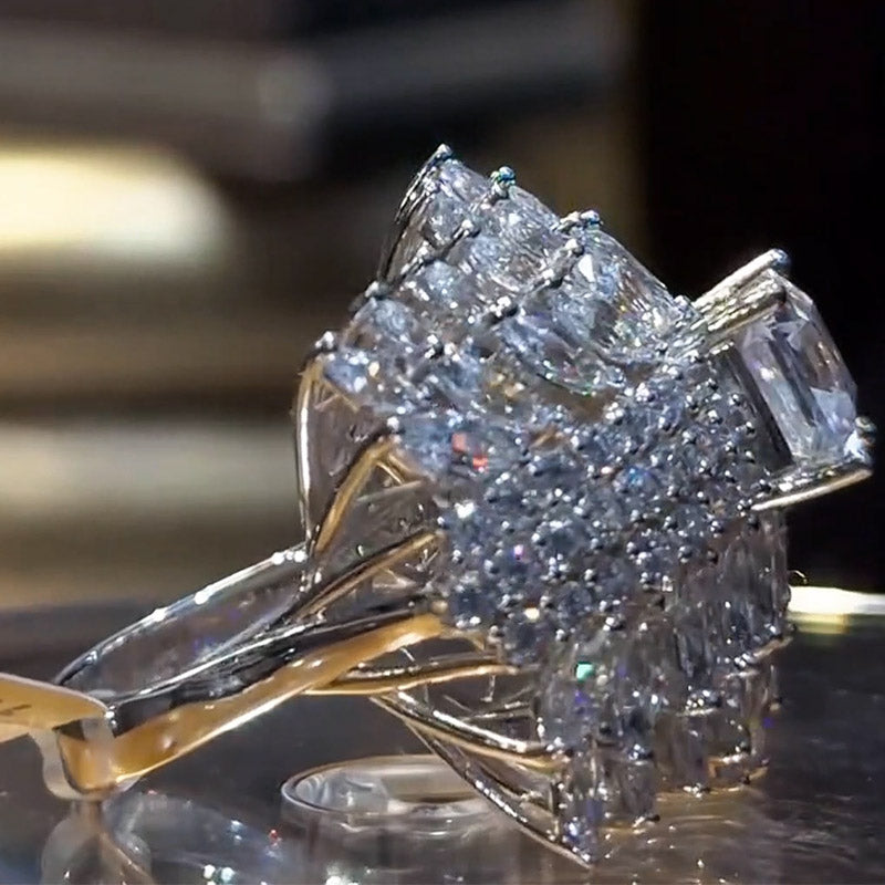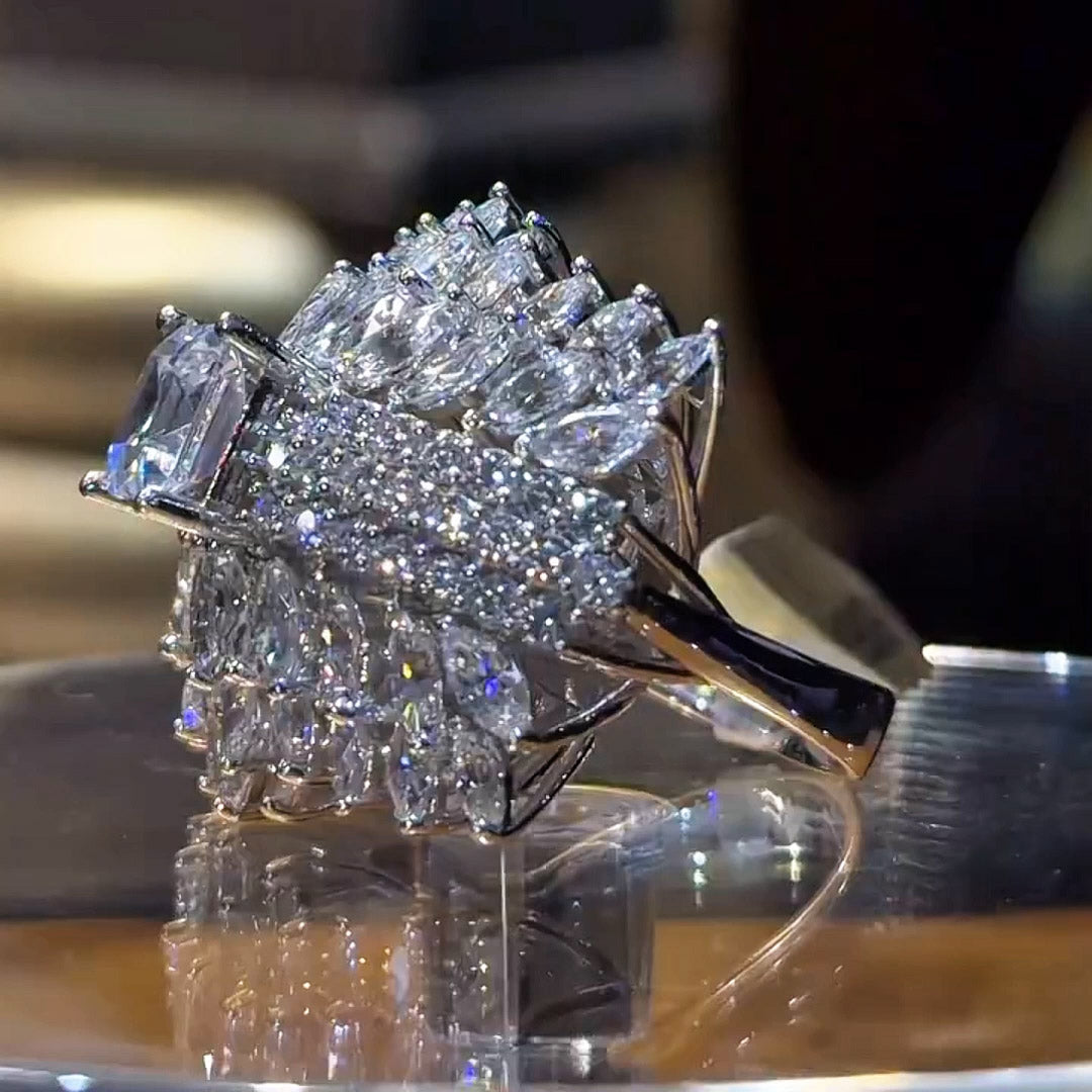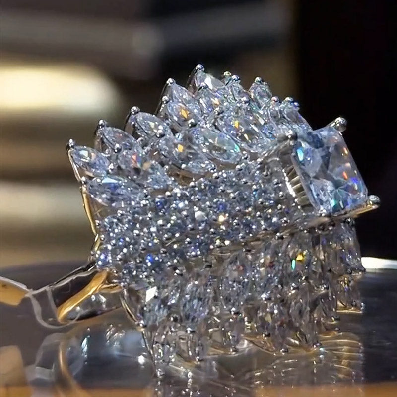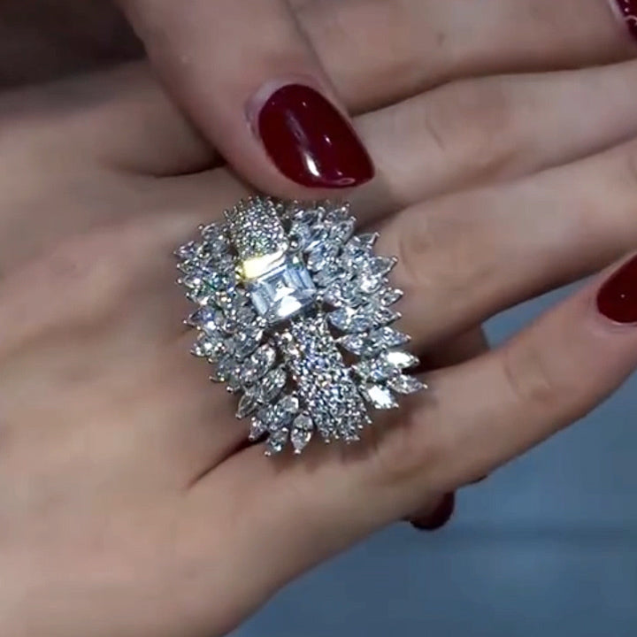 This sapphire-encrusted ring is dazzling, as if you're wearing the starry sky on your fingertips. The central square Ascher-cut center stone, surrounded by delicate marquise and round side diamonds, layers upon layers, radiate unparalleled brilliance. It's not just a piece of jewelry, but a work of art, perfectly showcasing the fusion of luxury and elegance. Wearing it will instantly make you the center of attention, exuding queen-like presence.