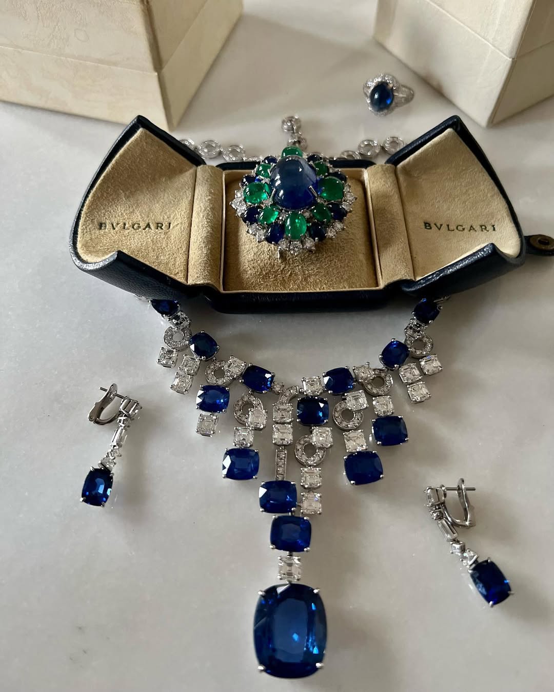This exquisite ring and brooch, with its interplay of blue and green gemstones, and the sapphire set throughout, exudes nobility and elegance, as if capturing the colors of the deep sea and forest, a symbol of timeless charm.