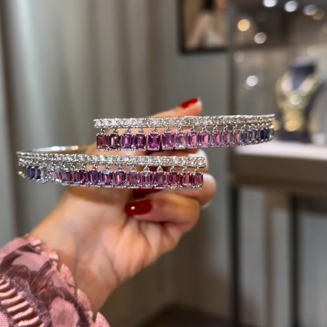This spectacular necklace showcases an impressive total carat weight of 40 carats, featuring emerald-cut sapphires in a mesmerizing array of colors, reminiscent of a rainbow. Each gemstone is meticulously set in a sleek silver framework that enhances the vivid hues and clarity of the sapphires.
