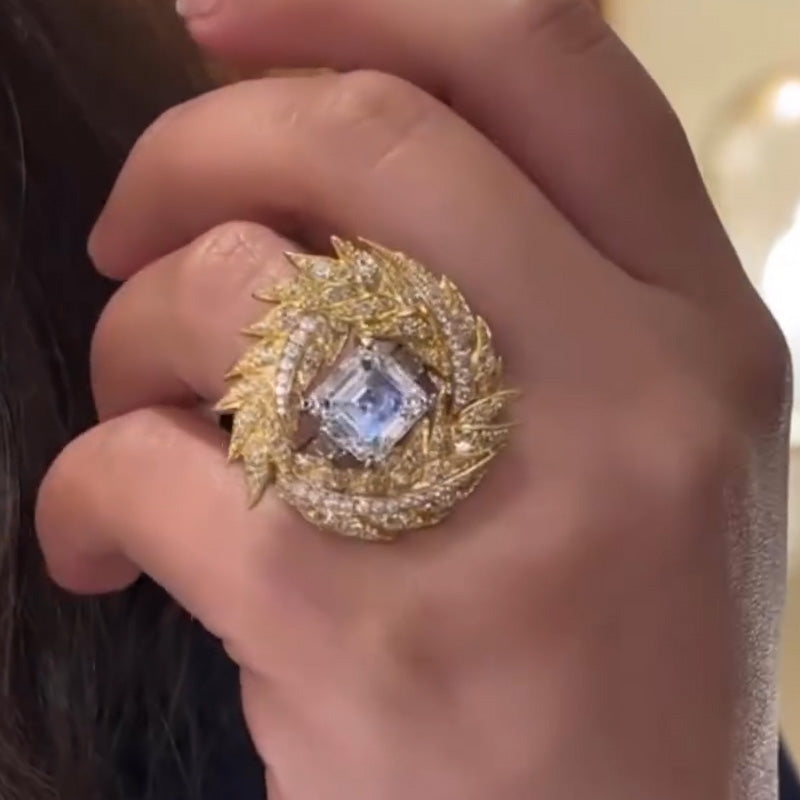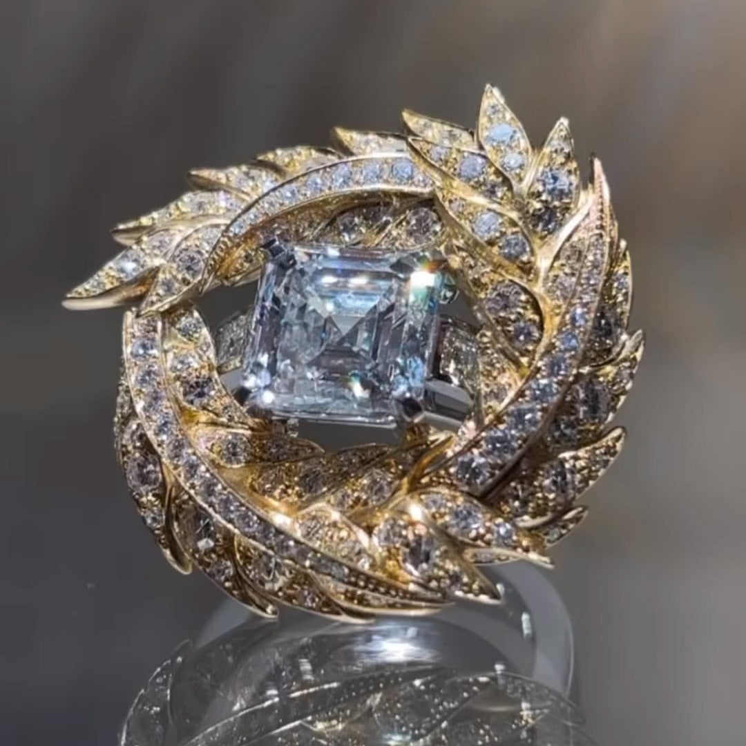 This is a ring with a 5.05 ctw square cut sapphire that radiates radiant beauty. In ancient Roman mythology, the ear of wheat is the symbol of Ceres, the goddess of harvest. During the First French Empire, it was a very popular motif with the nobility and the royal family, and according to historical records, Empress Josephine was fond of wearing a crown in the form of a wheat ear.
