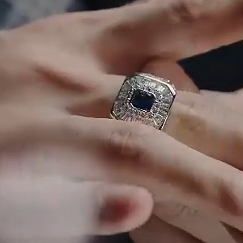This ring is luxury and elegance incarnate. Sharp lines of cool white gold cluster around a deep blue sapphire in the center, resembling the stillness of the night sky. The surrounding sapphires sparkle like tiny stars. It shines quietly, as if to tell a low-key but hard to ignore the noble, just waiting to add a unique charm and honor for the wearer.