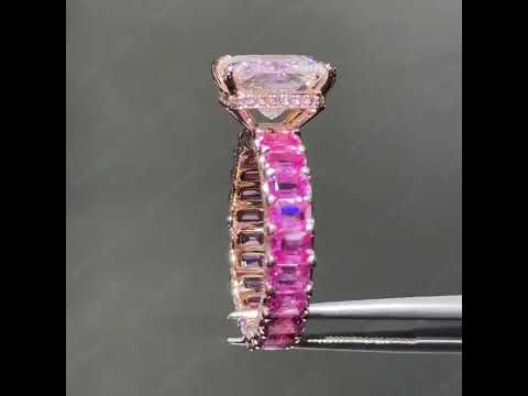 The center is a 4.63ct Radiant cut master stone, fancy sapphire. Pink multi sapphire eternity pattern accents 😍🥰... Warm and romantic.
