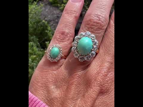 This absolutely stunning ring features a 5-carat turquoise center stone surrounded by 3-carat old mine-cut sapphires, set in an 18K gold-plated band 🤩 I absolutely love it!