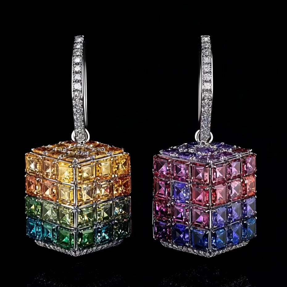 The earrings are a pair of statement-making earrings that embody a kaleidoscope of brilliant brilliance in a bold, structured cube design.