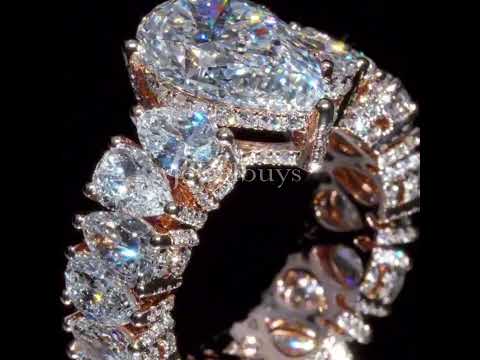 This elegant engagement ring features a stunning 6-carat pear cut white sapphire, accompanied by 50 smaller pointer diamonds or sapphires, set in the warm glow of rose gold. The pear cut center stone offers a unique and sophisticated silhouette, while the surrounding pointers add an extra layer of brilliance and sparkle. The rose gold setting brings a romantic touch to the design, making this ring a perfect blend of classic elegance and modern allure. Whether it's for a proposal or a milestone celebration, this ring is designed to symbolize your eternal love with timeless beauty.