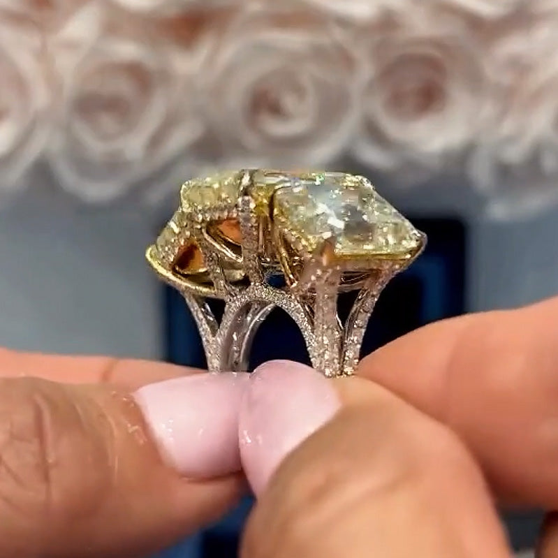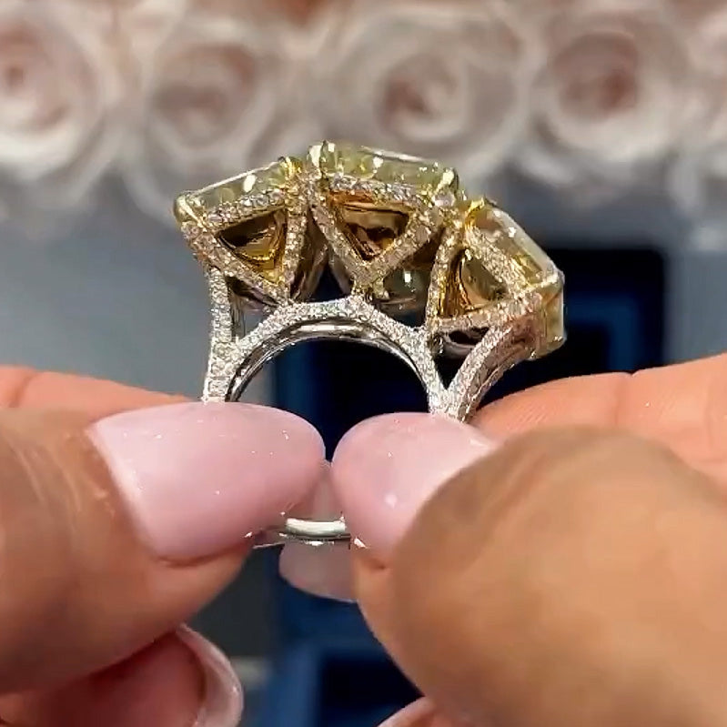 Introducing our stunning 8ctw Women's Engagement Ring, featuring three breathtaking main stones of emerald-cut yellow sapphires elegantly set in a sleek silver band. The centerpiece is adorned with a pave of sparkling diamonds, adding a touch of luxury and shimmer to this timeless piece. Perfect for the modern bride who appreciates both sophistication and a pop of color, this ring is a true symbol of love and commitment. Embrace the beauty of this exquisite engagement ring, featuring emerald cut, yellow sapphires, pave diamonds, and silver craftsmanship.