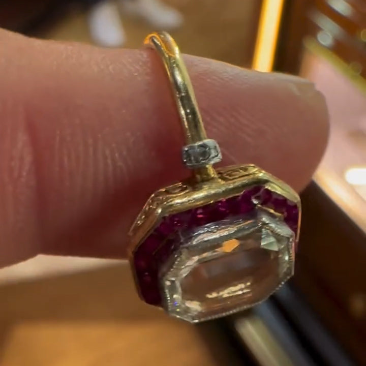 Art Deco Portrait Cut Sapphire and Ruby Ring, circa 1920, centering upon an octagonal portrait-cut sapphire, withing a surround of calibre-cut rubies, set in 18k yellow gold.