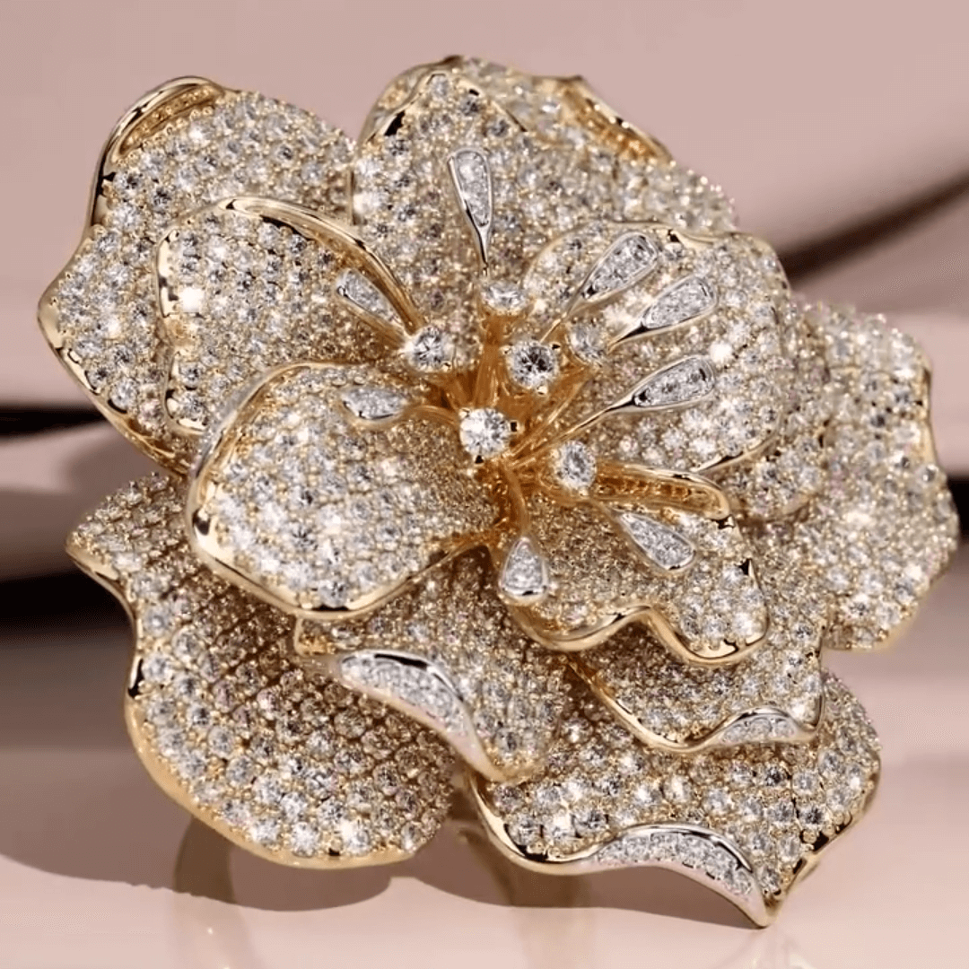 Celebrate your love with the unique beauty of this engaging ring which features a total of 4 carats of white sapphires in different size of round cuts, artfully arranged in a flower-shaped design, set in gleaming gold. The combination of different sizes, creates a dynamic and sparkling center that resembles a blooming flower, symbolizing the growth and beauty of your relationship. The gold setting adds a touch of warmth and elegance, making this ring a perfect blend of creativity and classic romance. Whether it's for an engagement or a special gift, this ring is designed to capture the essence of your unique bond with its intricate and captivating design.