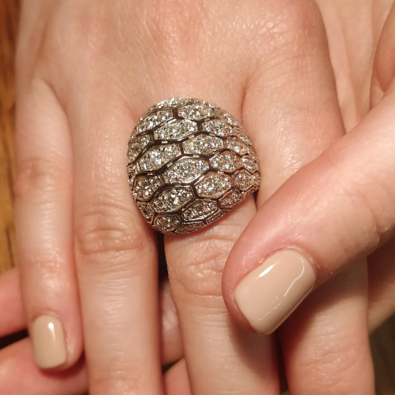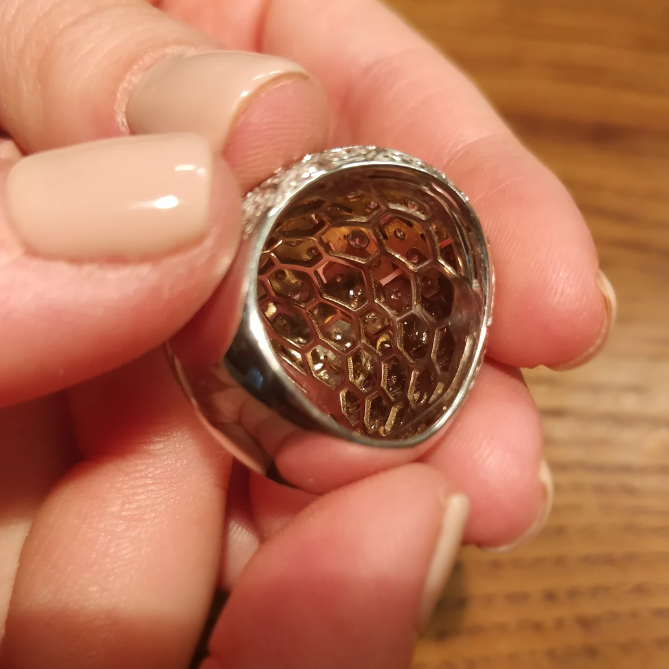 This ring has a sophisticated and stylish design. The craftsmanship is exquisite and sparkling. It is pave set with brilliant round cut white stones. Suitable for many occasions. Total weight is approximately 3 carats. The ring is made of 925 silver throughout. with thick gold plating. which makes the luster last longer compared to other single layer plating. The style is personalized and stylish. bringing more possibilities for your fashion collocation.