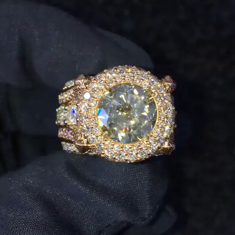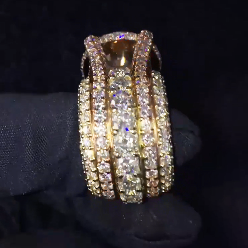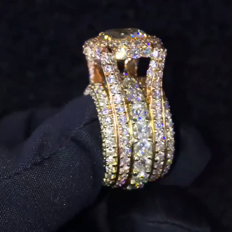 This gorgeous engagement ring has a unique design. The craftsmanship is exquisite and sparkling. The center features a brilliant round cut white main stone. The arms are pave set with round cut white stones. The elevated main stone is the highlight of this ring. Total weight is approximately 12 carats. The ring is made of 925 silver throughout. with thick gold plating. which makes the luster last longer compared to other single layer plating. The style is personalized and gorgeous. bringing more possibilities for your fashion collocation.