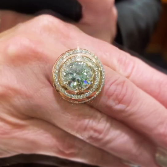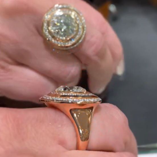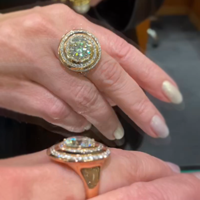 This gorgeous ring has a classic minimalist design. The center features a brilliant round cut white stone. It is surrounded by a double spiral halo of round cut white stones. Unique and sparkling. Total weight is approximately 8 carats. The ring is made of 925 silver throughout. with thick gold plating. which makes the luster last longer compared to other single layer plating. The style is personalized and simple. bringing more possibilities for your fashion collocation.