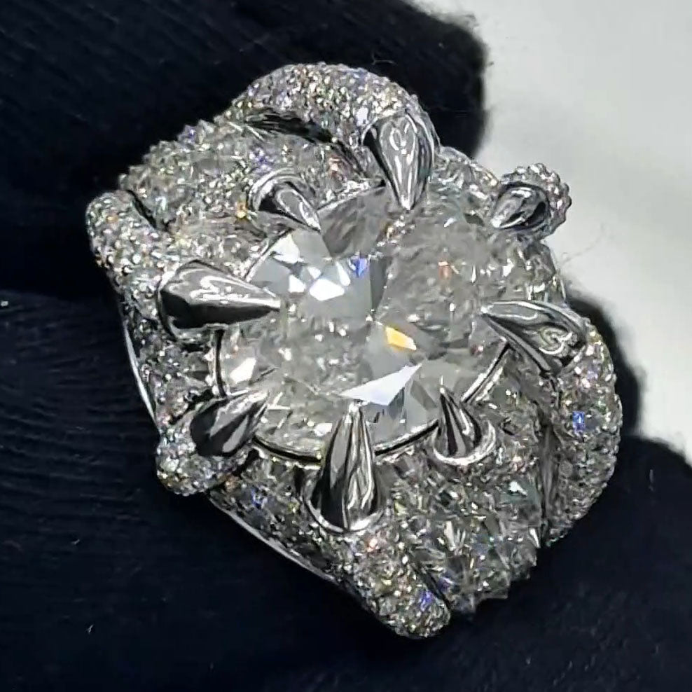 Introducing an exquisitely crafted Gothic-inspired engagement ring for the discerning woman. This stunning piece showcases a captivating 5-carat oval-cut white sapphire center stone, surrounded by an inverted set diamond shank, adding a touch of luxury and sparkle. Crafted in gleaming silver, this ring exudes timeless elegance and sophistication, making it the perfect symbol of your eternal love. Perfect for those who appreciate the beauty of unique and intricate designs, this engagement ring is sure to impress. Key words: Gothic, oval cut, white sapphire, inverted set diamond shank, silver, engagement ring.