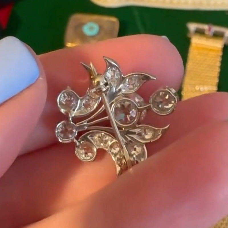 This is a vintage platinum-plated brooch with old-cut sapphires! The stones are truly stunning! The center stone weighs 1.25 carats, and the total weight is approximately 2.5 carats. It comes with a matching ring.