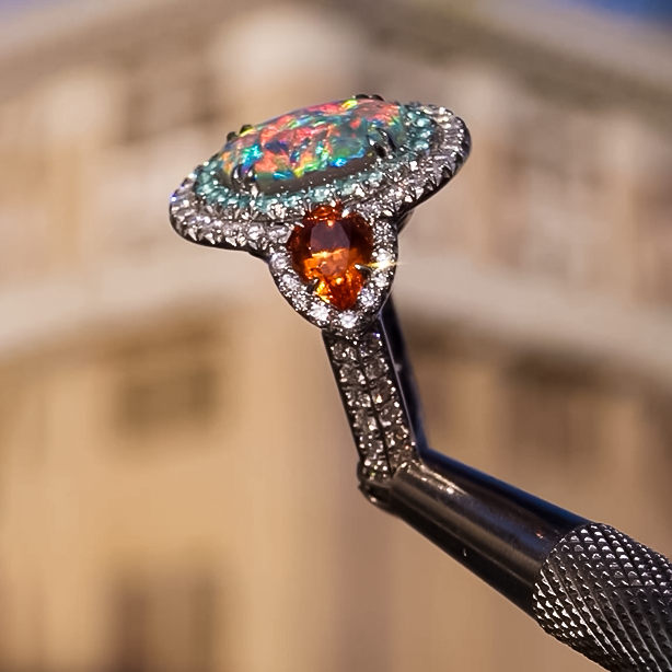 This is a stunning ring! The classic three-stone design features a gorgeous opal main stone in the center. flanked by two bright orange stones with a double halo of round-cut light blue and white stones. The whole ring sparkles and shines! Total weight is approximately 6 carats. The ring is made of 925 silver throughout. with thick gold plating. which makes the luster last longer compared to other single layer plating. The style is personalized and classic. bringing more possibilities for your fashion collocation.
